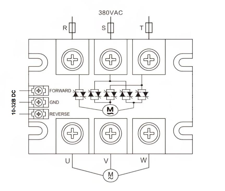 SAR - Твердотельные трехфазные реверсивные реле с управлением 10...32V DC имеют широкое распространение в различных областях промышленности. Типичное применение - системы с электродвигателями, где происходит частая коммутация.